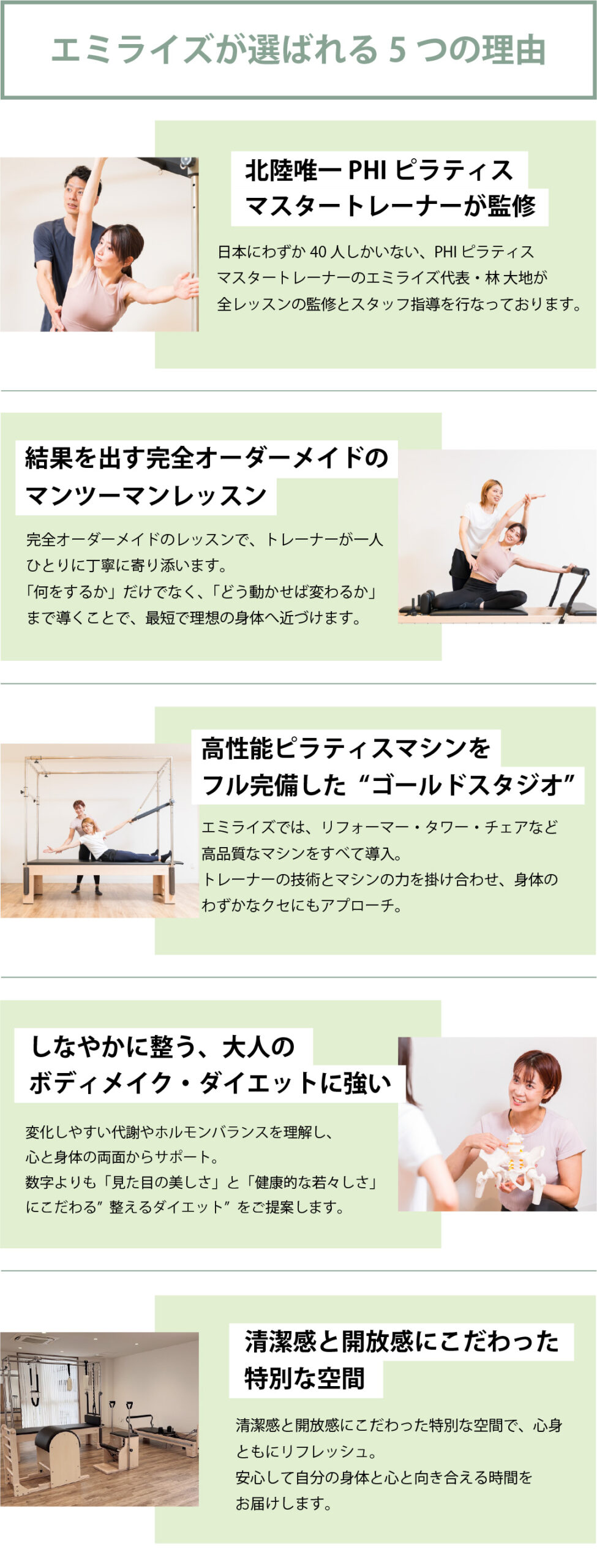 エミライズはマンツーマンのパーソナルレッスンを専門としており、あなたに合ったエクササイズを行うことで最短期間で効果を感じてもらうことを大切にしています!